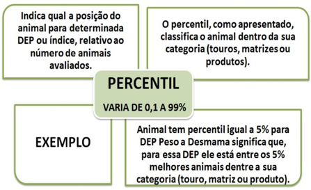 Percentil % - Serve para facilitar ainda mais a interpretação pelo criador quanto a colocação do animal na população avaliada (%), para a respectiva DEP. O Percentil aparece no índice de qualificação genética (IQG), geral do programa, como em todas as características avaliadas. Por exemplo, um animal no percentil 10% significa que está entre os 10% melhores daquela população para aquela característica avaliada.